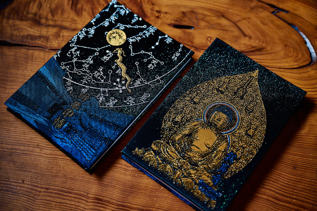 This Goshuin Stamp Book is made of Nishijin-ori fabric and features illustrations of Ryuganji Temple’s various halls and the principal image of Amida Buddha. Above them is a star chart drawn by astronomer SHIBUKAWA Harumi, who lived here, and a dragon soaring into the heavens.
